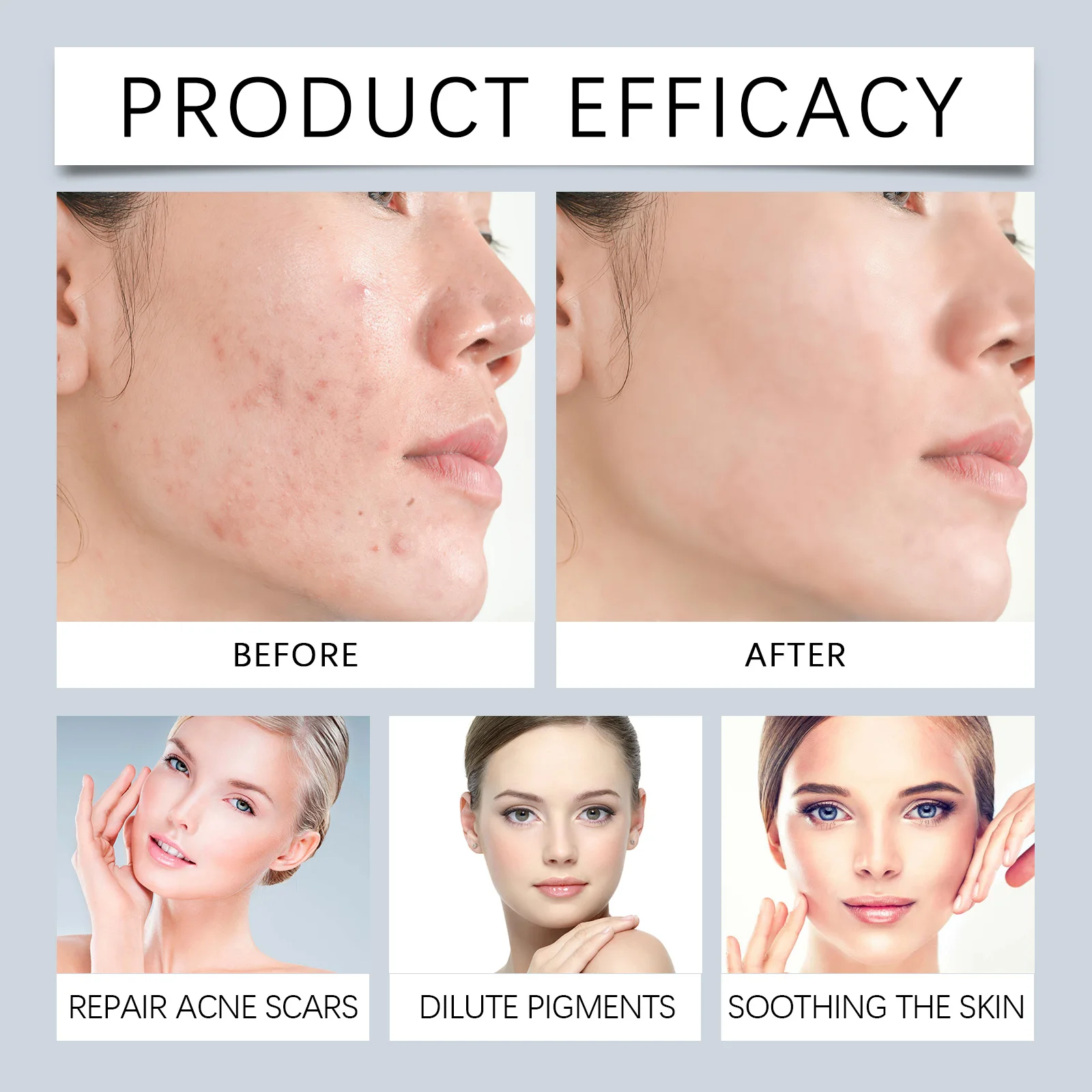 7. Usage: Clean your face and keep it dry. Take an appropriate amount of this product and apply it evenly to your face. Gently massage to promote absorption. And it can remove acne scars and restore smooth skin.
